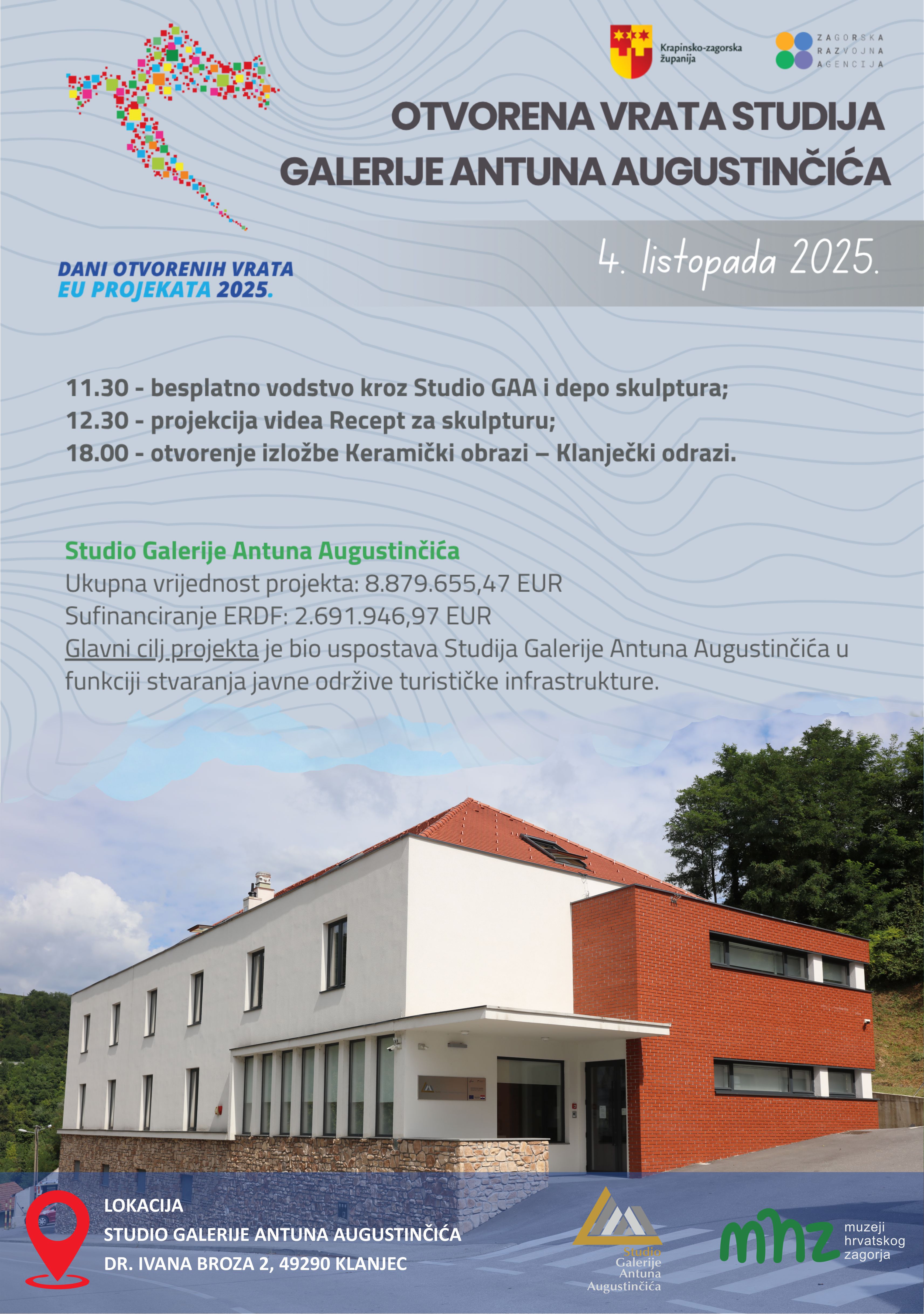 Na poziv Ministarstva regionalnoga razvoja i fondova Europske unije te Zagorske razvojne agencije, Muzeji Hrvatskog zagorja – Galerija Antuna Augustinčića ponovno se uključuju u manifestaciju Otvorena vrata EU projekata 2025. Cilj je događanja promovirati projekte sufinancirane sredstvima Europske unije i pokazati njihovu vrijednost kao motivaciju i primjer budućim korisnicima EU fondova.