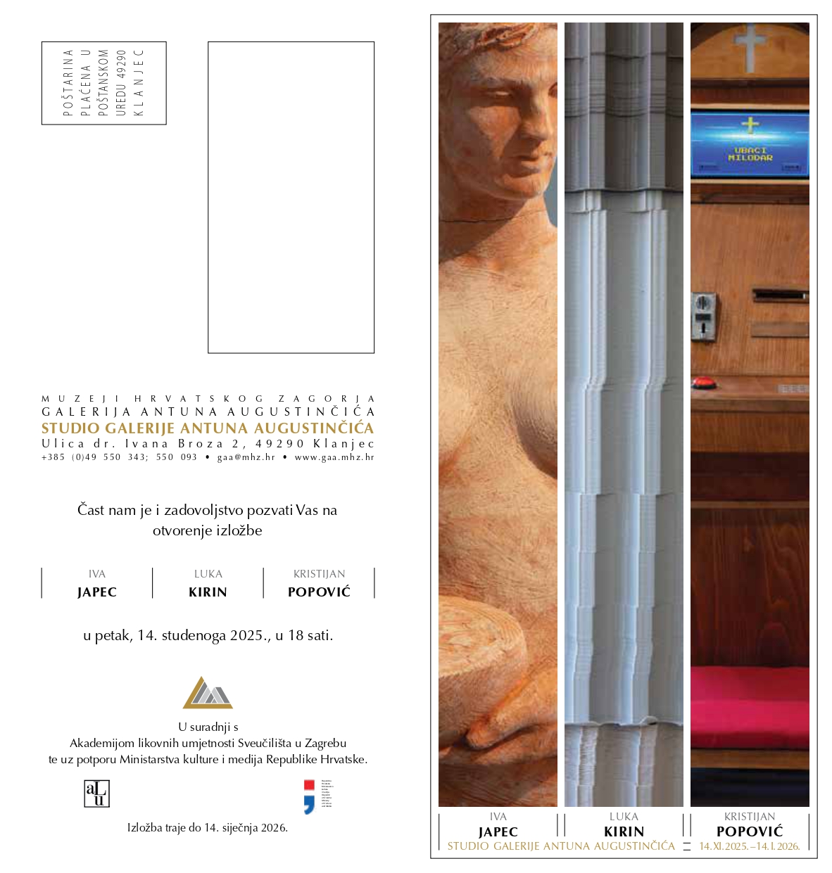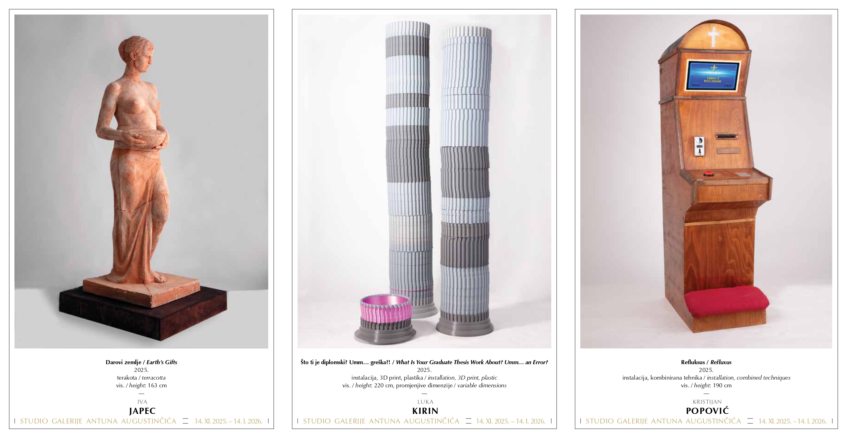 Suradnja Galerije Antuna Augustinčića i Akademije likovnih umjetnosti u Zagrebu već petnaestu godinu zaredom potvrđuje se kao plodonosna i svake godine rezultira izložbom talentiranih diplomanata kiparstva u prostoru klanječke Galerije.Ovogodišnja izložba predstavlja troje mladih koji kiparstvu pristupaju u skladu sa svojim vlastitim preferencijama: kroz oslonac na tradicionalnu figuraciju, novim tehnologijama koje potiču eksperimente i djelima imanentne socijalne provokacije.