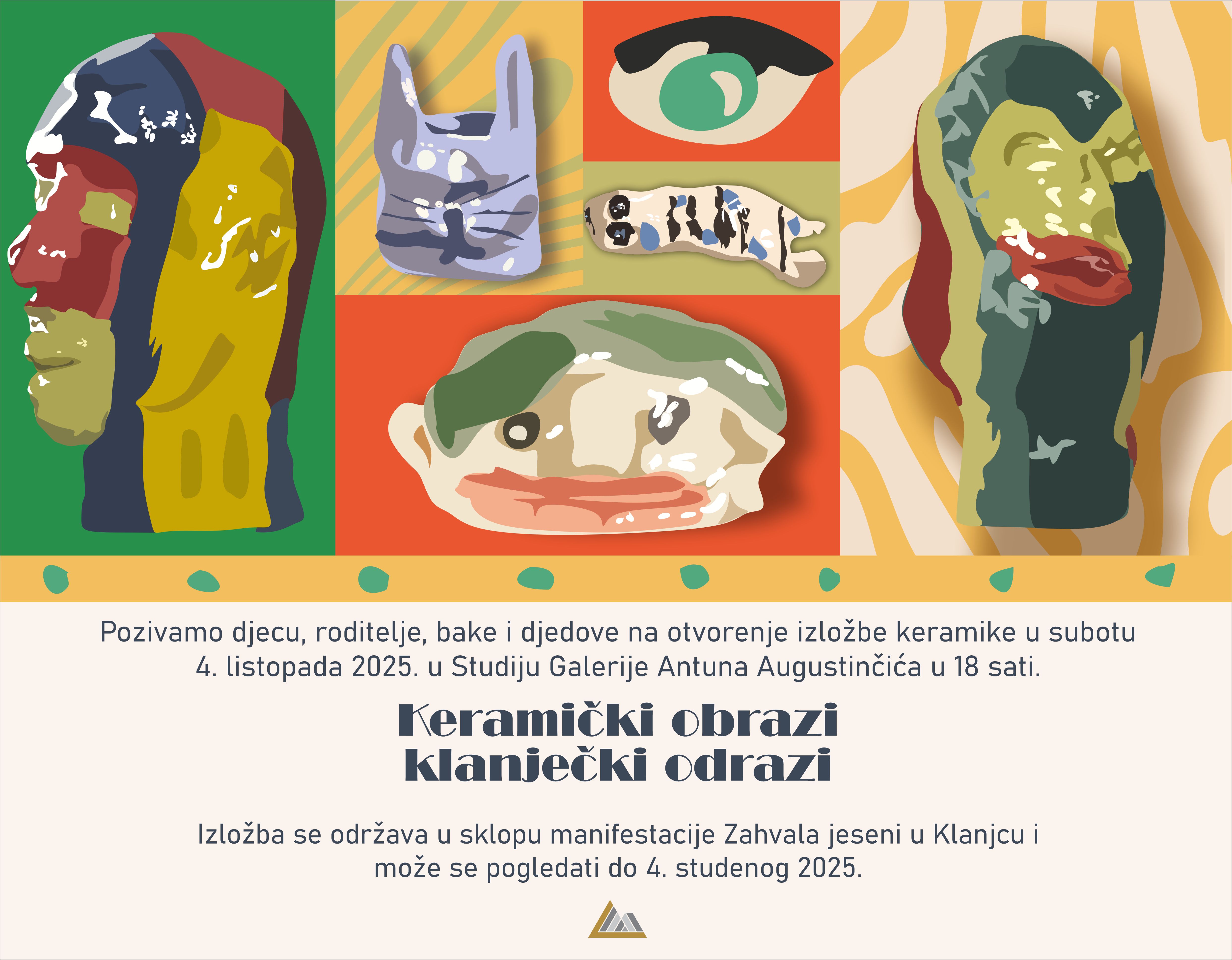 U sklopu manifestacije Zahvala jeseni u Klanjcu, u subotu, 4. listopada 2025. godine u u 18 sati u Studiju Galerije Antuna Augustinčića otvara se izložba dječjih radova Keramički obrazi - klanječki odrazi.
